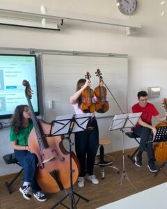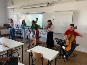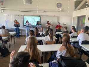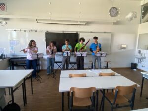 U okviru nastave predmeta Glazbena umjetnost našim su učenicima na zanimljiv i neformalan način predstavljene različite skupine instrumenata koje čine simfonijski orkestar. Mladi glazbenici iz udruge podijelili su s nama informacije o svojim glazbenim početcima i predstavili gudačke (violinu, violu, violončelo i kontrabas) i puhačke instrumente (truba, saksofon, oboa, flauta, piccolo, fagot) te različite udaraljke. Svaka radionica završila je odabranim koncertnim točkama koje su dočarale specifičnosti pojedinih instrumenata i njihove interpretativne mogućnosti.