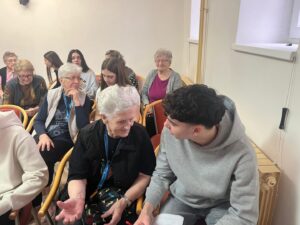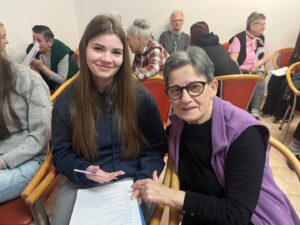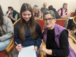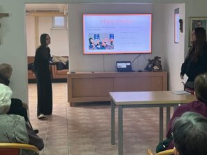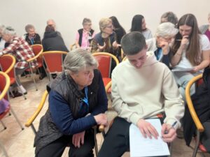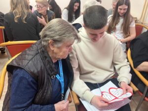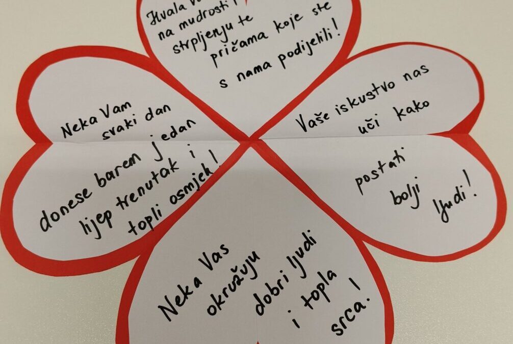 Učenici su korisnicima doma predstavili našu školu te izvannastavne aktivnosti u koje su uključeni, a potom su kroz razgovor obradili važne teme poput prava starijih osoba, njihova mjesta u zajednici, kao i pitanja što mladi mogu naučiti od starijih, a što stariji od mlađih. Posebno vrijedan dio susreta bio je razgovor s korisnicima doma, koji su s učenicima podijelili svoje životne priče, iskustva i mudre savjete. Učenici su njihove odgovore pažljivo slušali i bilježili, obogaćeni novim spoznajama i perspektivama. Kako bismo susret učinili još posebnijim, pripremili smo prigodne čestitke s lijepim porukama koje su izmamile osmijehe na lica korisnika i ispunile njihova srca toplinom i radošću.